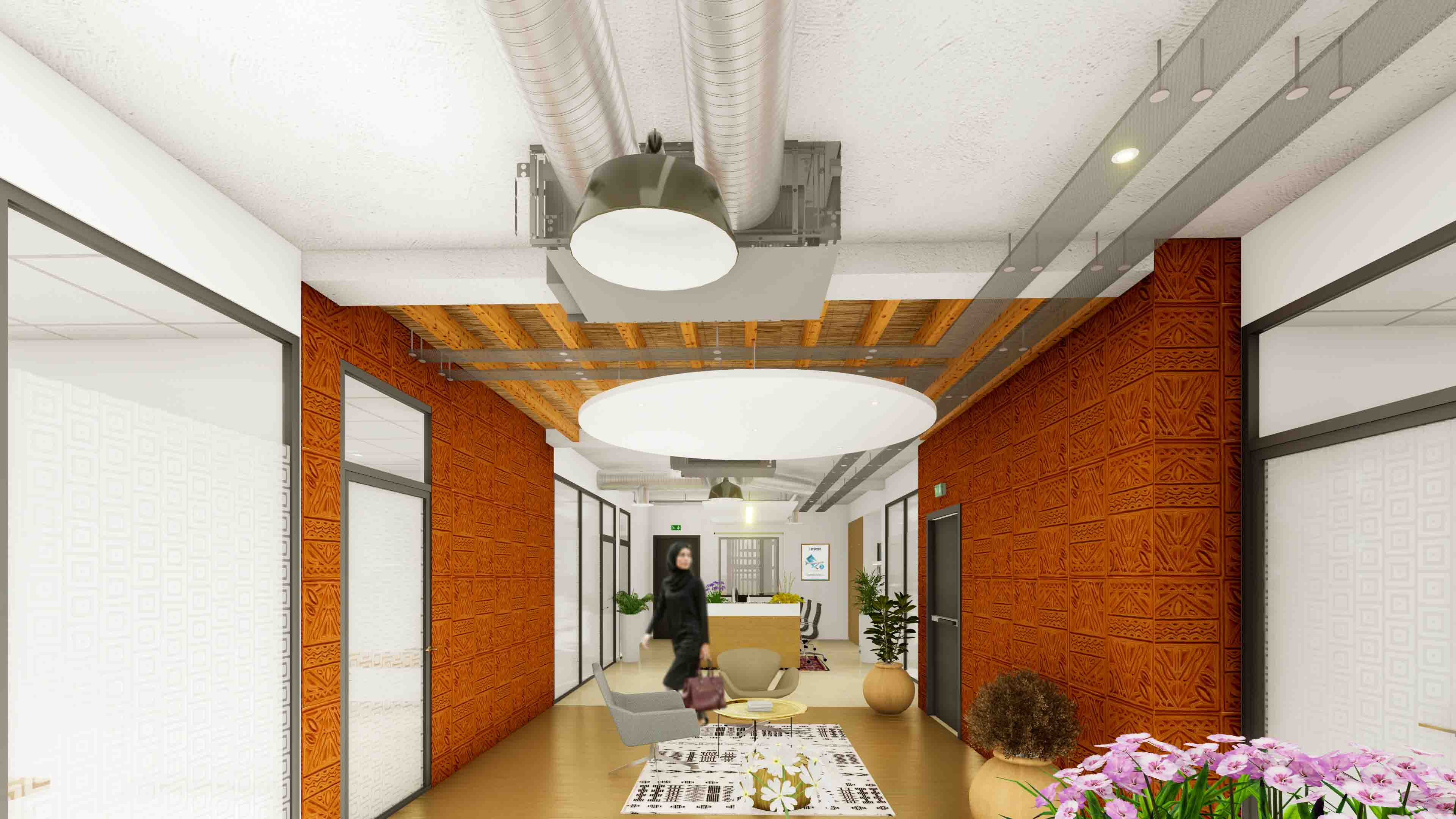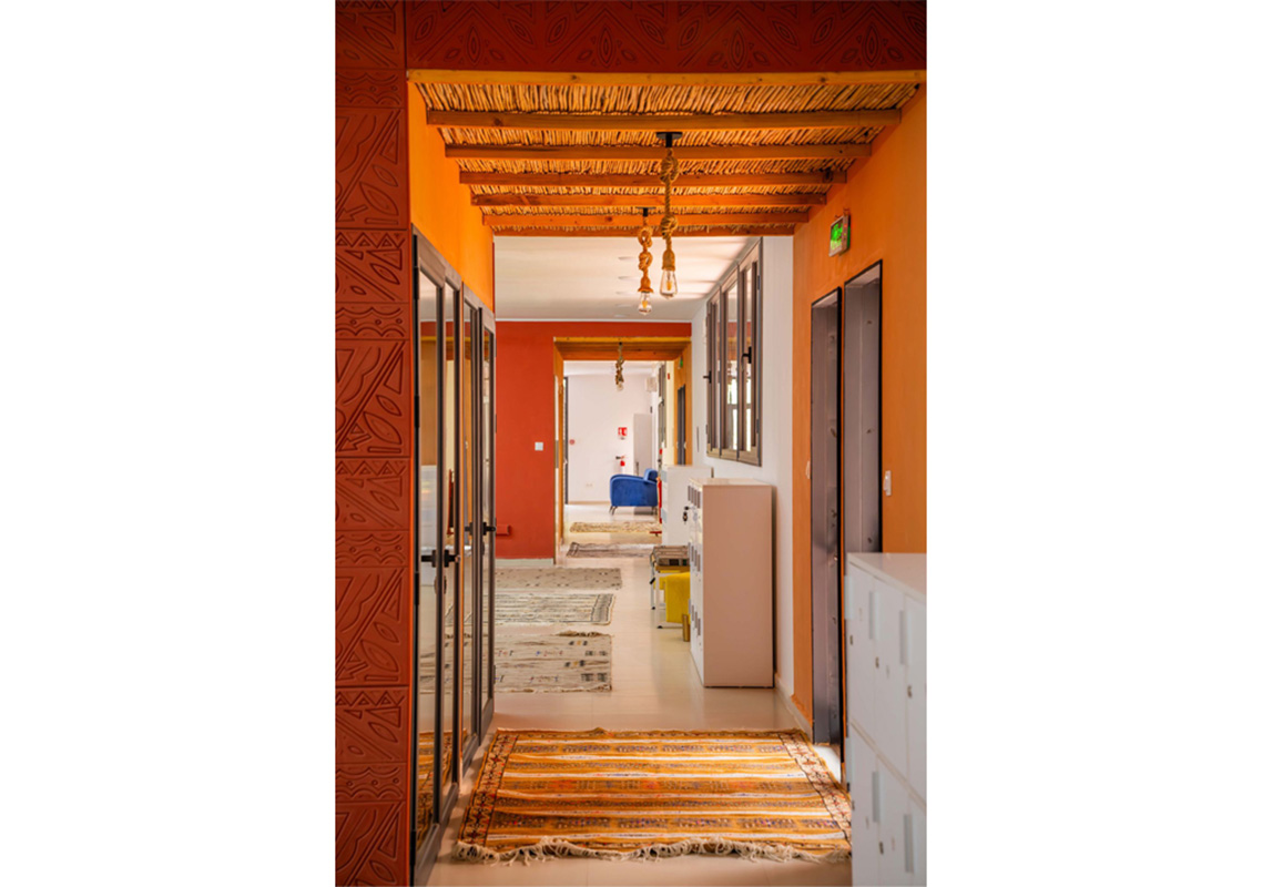 C’est dans les locaux de l’université de Ouargla que nous sommes intervenus, en collaboration avec l’entreprise KHKTB, pour la réalisation du Hub of Excellence by SLB. Ce projet concerne un espace de 700 m², constitué d’anciennes salles de classe et d’un grand amphithéâtre, entièrement réaménagés en différentes structures dédiées : un incubateur d’entreprises, un espace de coworking, une grande salle pour événements, un studio podcast, des bureaux ainsi que plusieurs salles de formation. L’ensemble est organisé autour d’un patio longitudinal, où des espaces ombragés et des pergolas ont été créés autour des deux arbres existants, permettant de profiter de l’extérieur même en période de forte chaleur. Le projet intègre et réinterprète plusieurs éléments d’architecture saharienne et d’ambiances traditionnelles, tels que des murs décoratifs en terre, des plafonds en poutres de bois et canisses, ainsi que des enduits extérieurs traditionnels.